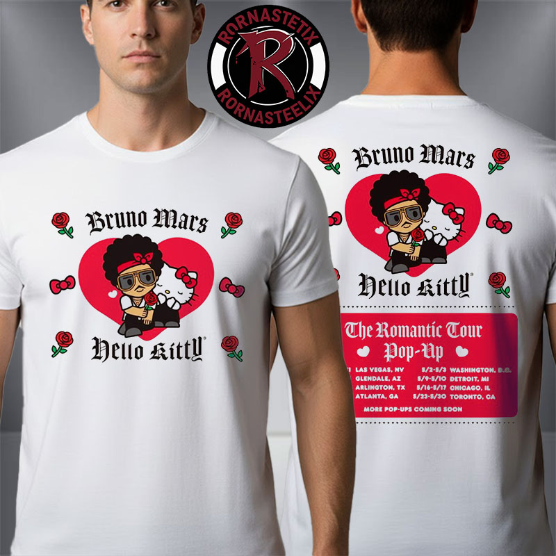 Product Overview: Bruno Mars x Hello Kitty The Romantic Tour 2026 Pop Up North America Schedule Tour Dates Unisex T Shirt Two Sided