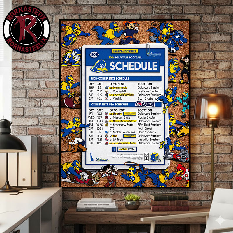 The Blue Hens are taking flight in a brand-new landscape! Stay on top of every kickoff, touchdown, and home-field advantage with the Official Delaware Fightin’ Blue Hens 2026 Schedule Poster Canvas. This premium piece of wall decor features the complete 2026 itinerary, combining the high-stakes Non-Conference matchups with the inaugural Conference USA (CUSA) conference schedule.