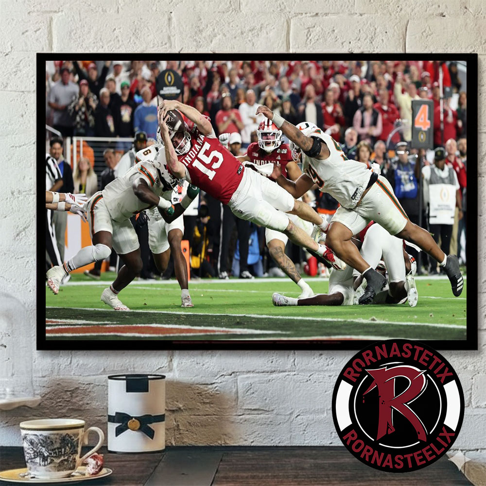 On January 19, 2026, the Indiana Hoosiers did what the world thought was impossible. This Horizontal Schedule & MVP Poster immortalizes the definitive image of that night: Fernando Mendoza going airborne. Facing a 4th-and-4 with the game on the line, the Miami native who was overlooked by his hometown team dove into the end zone, sealing the first-ever National Championship for the Crimson and Cream.